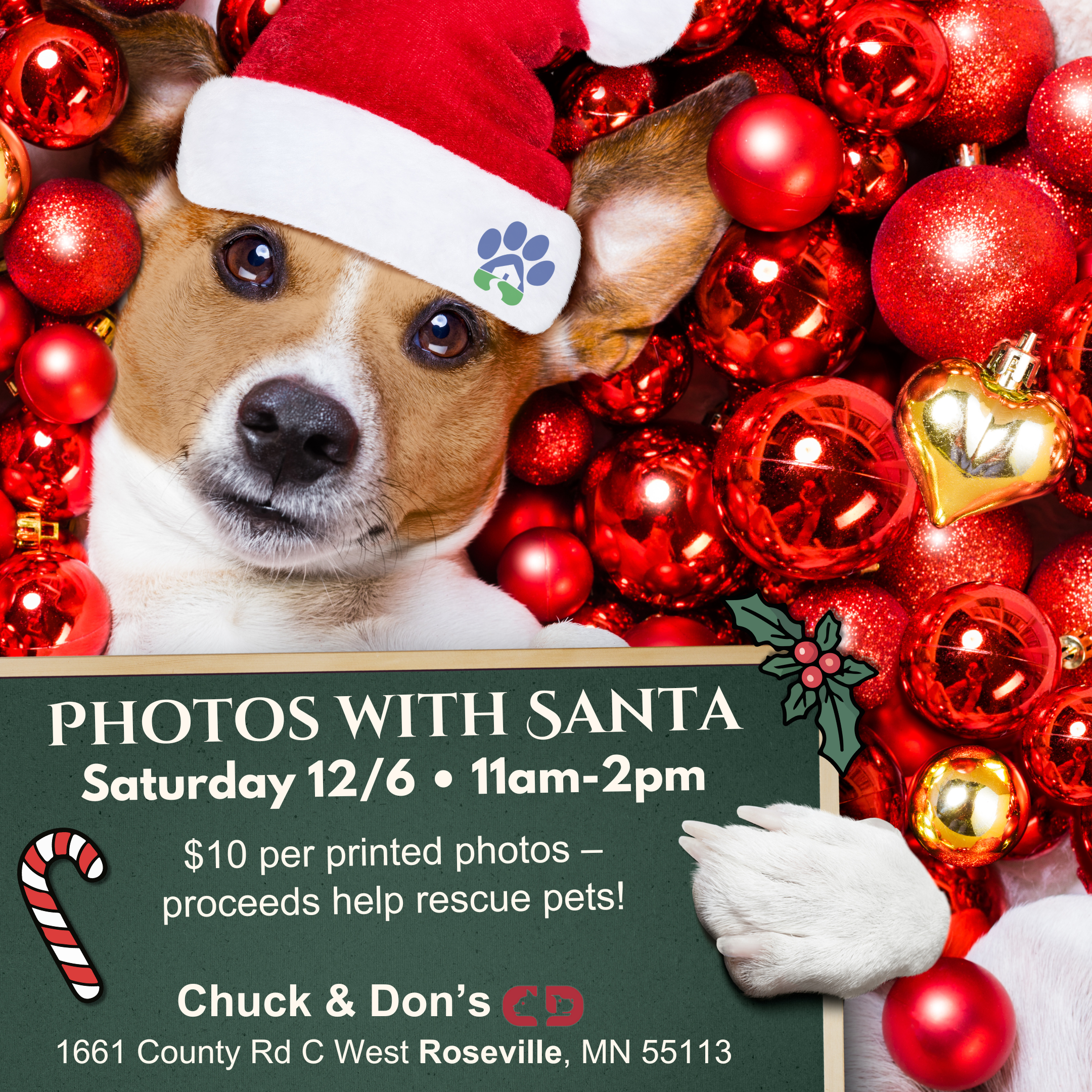 Join us for a festive holiday photo event at Chuck & Don’s in Roseville. This is the perfect opportunity to capture a special holiday memory with your pet while supporting a great cause.